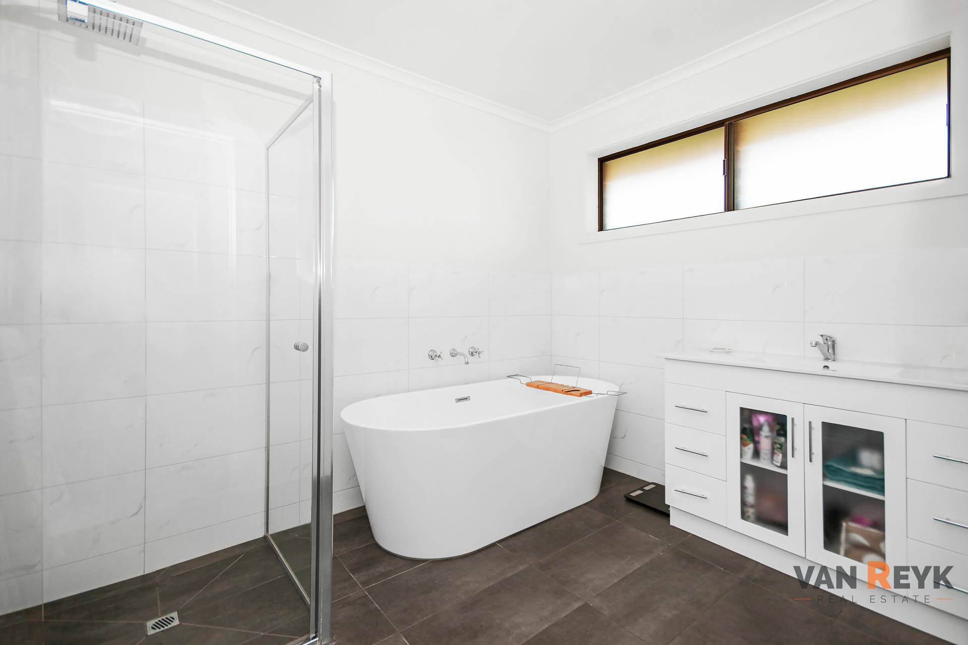 The bathroom is a highlight, boasting a sleek, free-standing deep bath, perfect for unwinding after a long day. Reverse cycle heating and cooling throughout ensure year-round comfort, keeping you cozy in winter and cool in summer.
